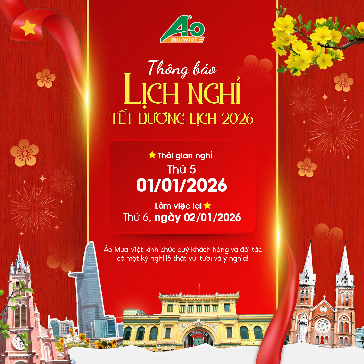 Nhân dịp Tết Dương Lịch 2026, Áo Mưa Việt xin trân trọng thông báo lịch nghỉ lễ như sau: